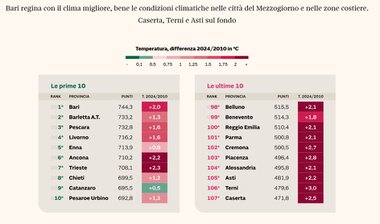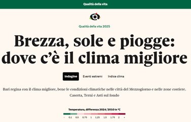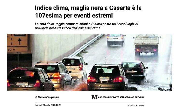 BASTA CON IL CONSUMO DI SUOLO Il clima mette Caserta all'indice: la città della Reggia ultima nella classifica del "Sole 24 ore" Presentata la classifica dell'indice del clima 2025 dal "Sole 24 ore", che presenta Caserta maglia nera nella classifica generale date le parecchie perfomances negative nelle 15 classifiche parziali per i 15 parametri scelti dal quotidiano economico. Tutti dettagli al seguente link: https://lab24.ilsole24ore.com/indice-del-clima/eventi-estremi.php In allegato anche le dichiarazioni di Gianfranco Tozza a "Il Mattino" in merito alla suddetta classifica. | |